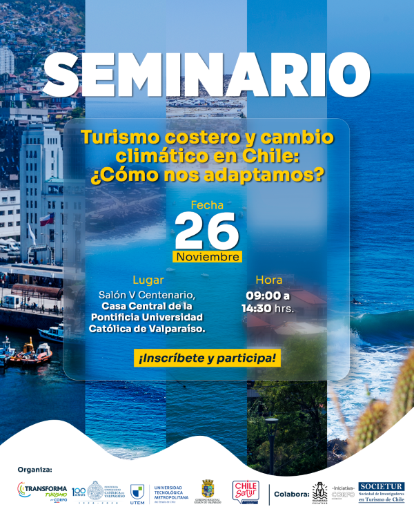 Con el propósito de impulsar un turismo más sostenible y responder a los efectos del cambio climático en las zonas costeras, el Programa Estratégico Nacional Transforma Turismo —impulsado por Corfo—, junto a nuestra universidad, la Pontificia Universidad Católica de Valparaíso, el Gobierno Regional de Valparaíso y ChileSertur A.G., llevará a cabo el seminario “Turismo costero y cambio climático en Chile: ¿Cómo nos adaptamos?”, que se realizará el miércoles 26 de noviembre en el Salón V Centenario de la Casa Central de la Pontificia Universidad Católica de Valparaíso.